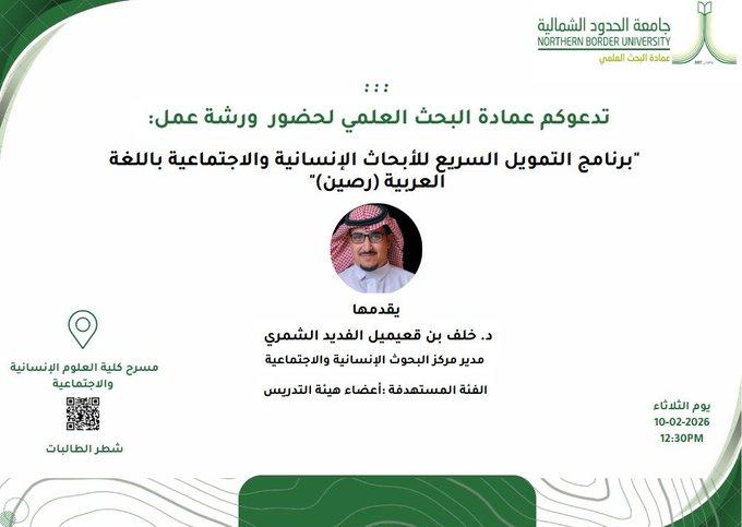 ضمن جهود عمادة البحث العلمي في دعم وتمكين الباحثين، ندعوكم لحضور ورشة عمل بعنوان : "برنامج التمويل السريع للأبحاث الإنسانية والاجتماعية باللغة العربية (رصين)” و ذلك تعزيزًا لجودة البحث العلمي ودعم الإنتاج المعرفي باللغة العربية.