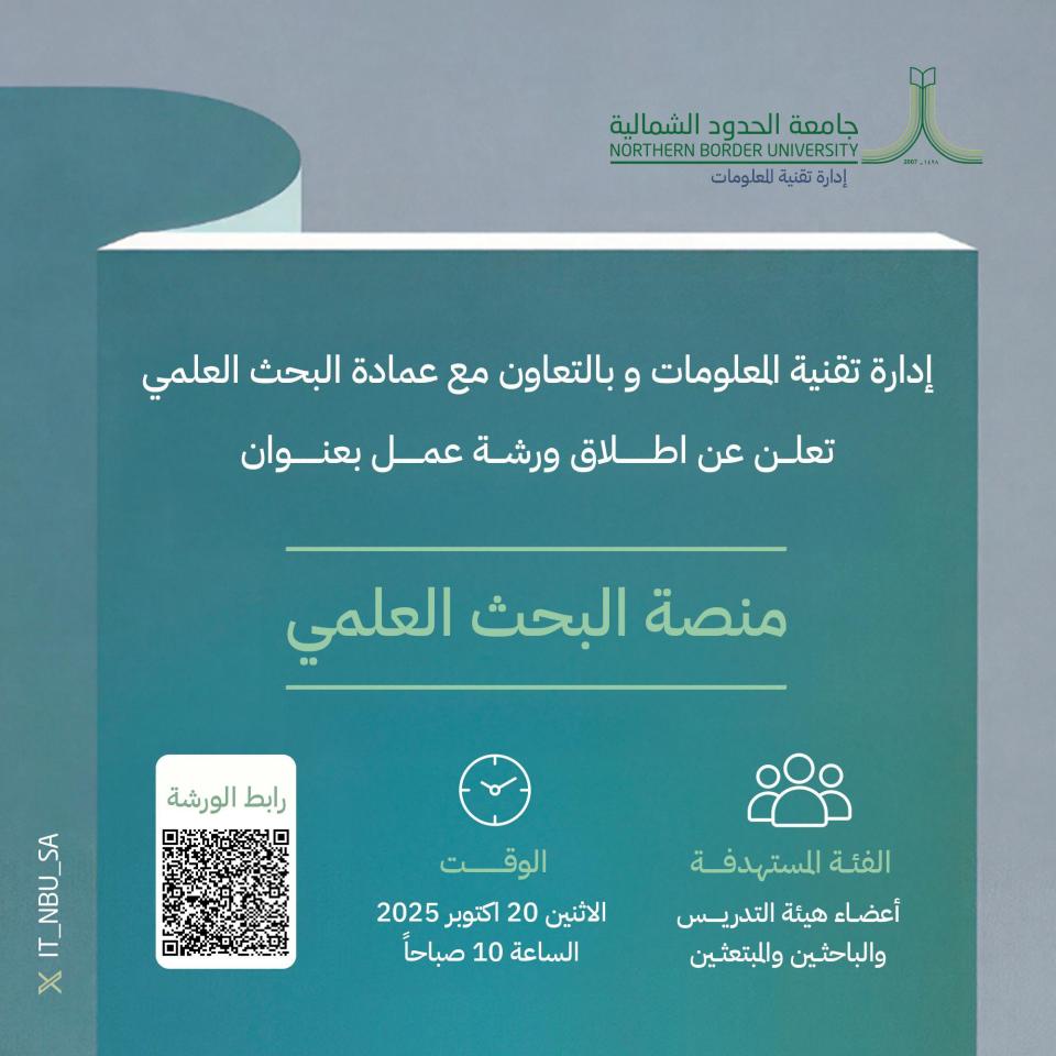 تدعوكم عمادة البحث العلمي لحضور ورشة عمل: النزاهة العلمية والأخلاقيات الطبية والحيوية يقدمها: د. منصور محمد العتيبي، عميد كلية العلوم الطبية التطبيقية د. قمر عفت الشمري، رئيسة قسم علم الأدوية والسموم - كلية الصيدلة ،أمين اللجنة المحلية الدائمة لأخلاقيات الحيوية والطبية الفئة المستهدفة: الباحثين طلبة مرحلة البكالوريوس والدراسات