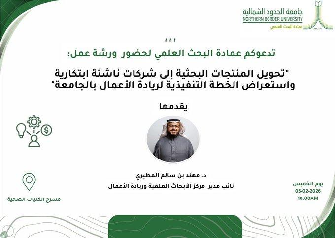 انطلاقاً من دور الجامعة في تمكين الابتكار وتعزيز الأثر البحثي، تُقيم عمادة البحث العلمي ورشة عمل بعنوان : تحويل المنتجات البحثية إلى شركات ناشئة ابتكارية