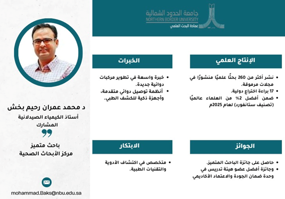 الدكتور محمد عمران رحيم بخش، الأستاذ المشارك في قسم الكيمياء الصيدلانية بكلية الصيدلة، وباحث متميز في مركز الأبحاث الصحية. ضمن أفضل 2% من الباحثين عالميًا وفق تصنيف ستانفورد.